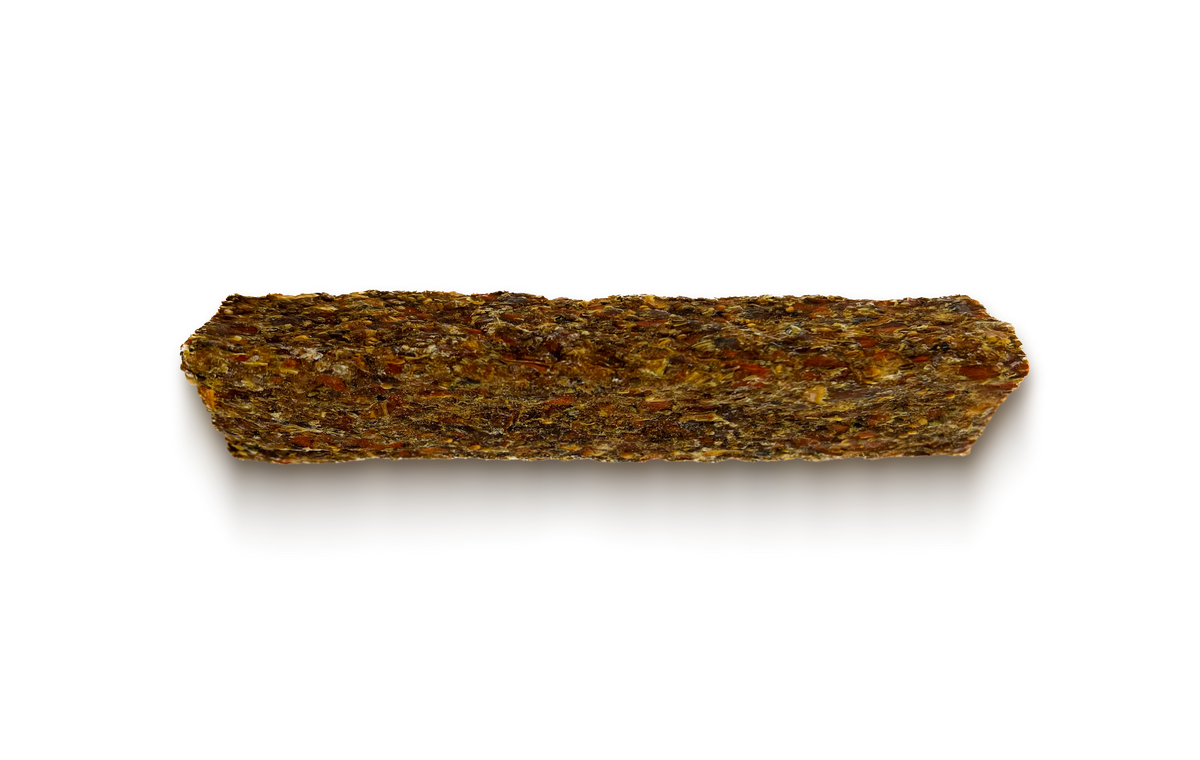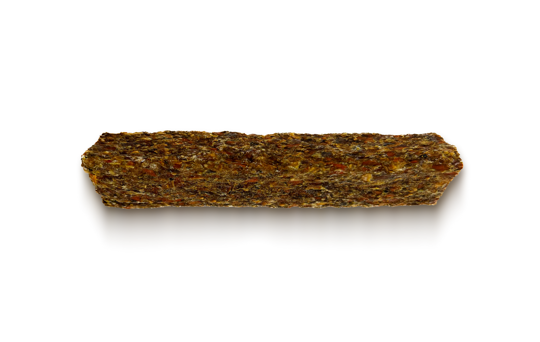 Pasternak, burgonyakeményítő, sárgarépa, marhabőr, oszt, kecskebőr, babka psyllium, szárított strucc, inaktív élesztőpehely, lenmag, sűrített meggylé, őrölt kurkuma, indiai tömjén, körte aroma – mindez egyetlen finomságban. Gondosan válogatott összetevők biztosítják az egyedülálló ízt és tápértéket, amelyek támogatják a kutyád egészségét.