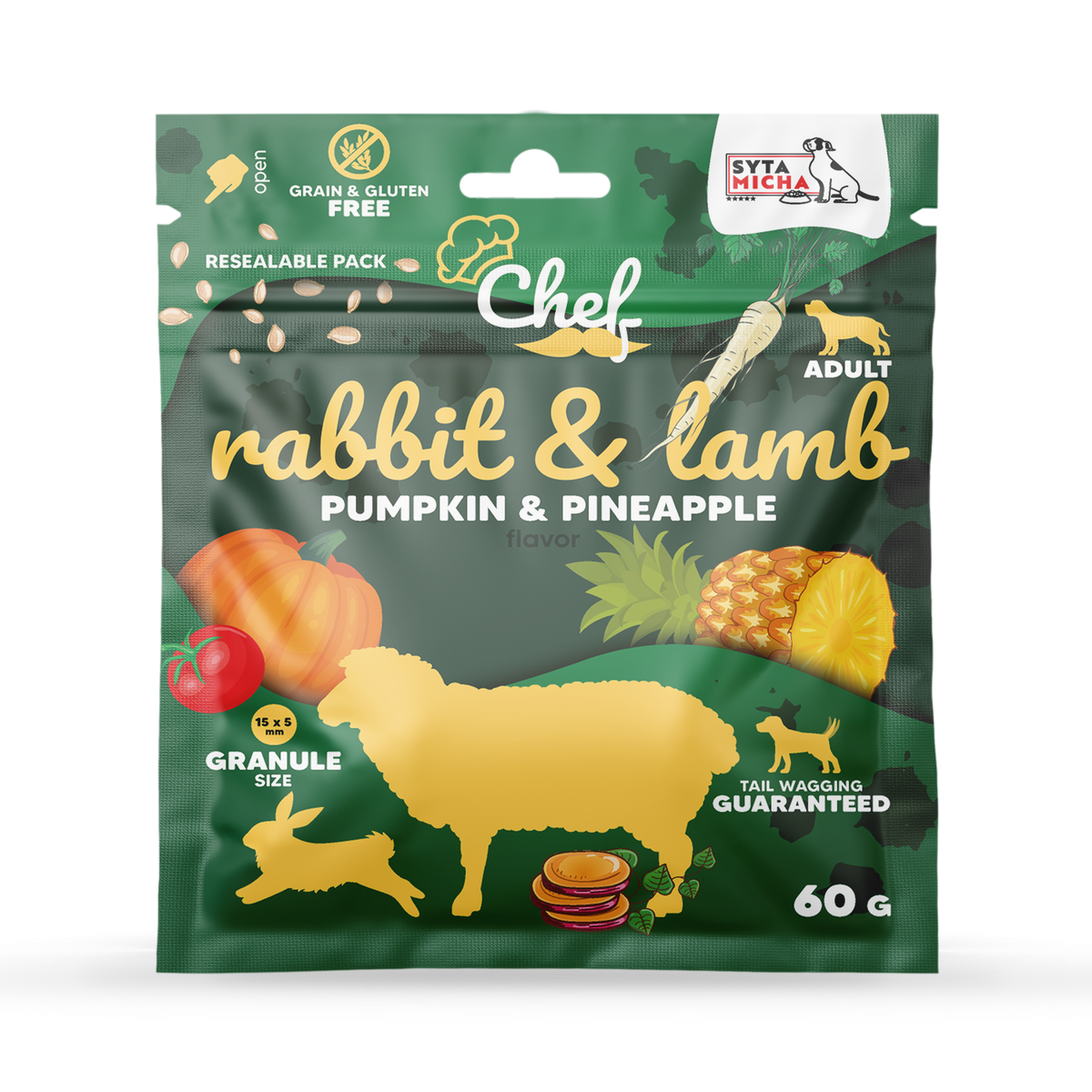 Syta Micha Кролик і ягнятина, гарбуз і ананас — це беззернова та повноцінна формула для кожного дорослого собаки. Це збалансований прийом їжі, у якому на першому місці стоїть до 60% м’яса кролика і ягнятини, відмінних джерел білка, необхідних для підтримки м’язової маси та правильної ваги тіла.