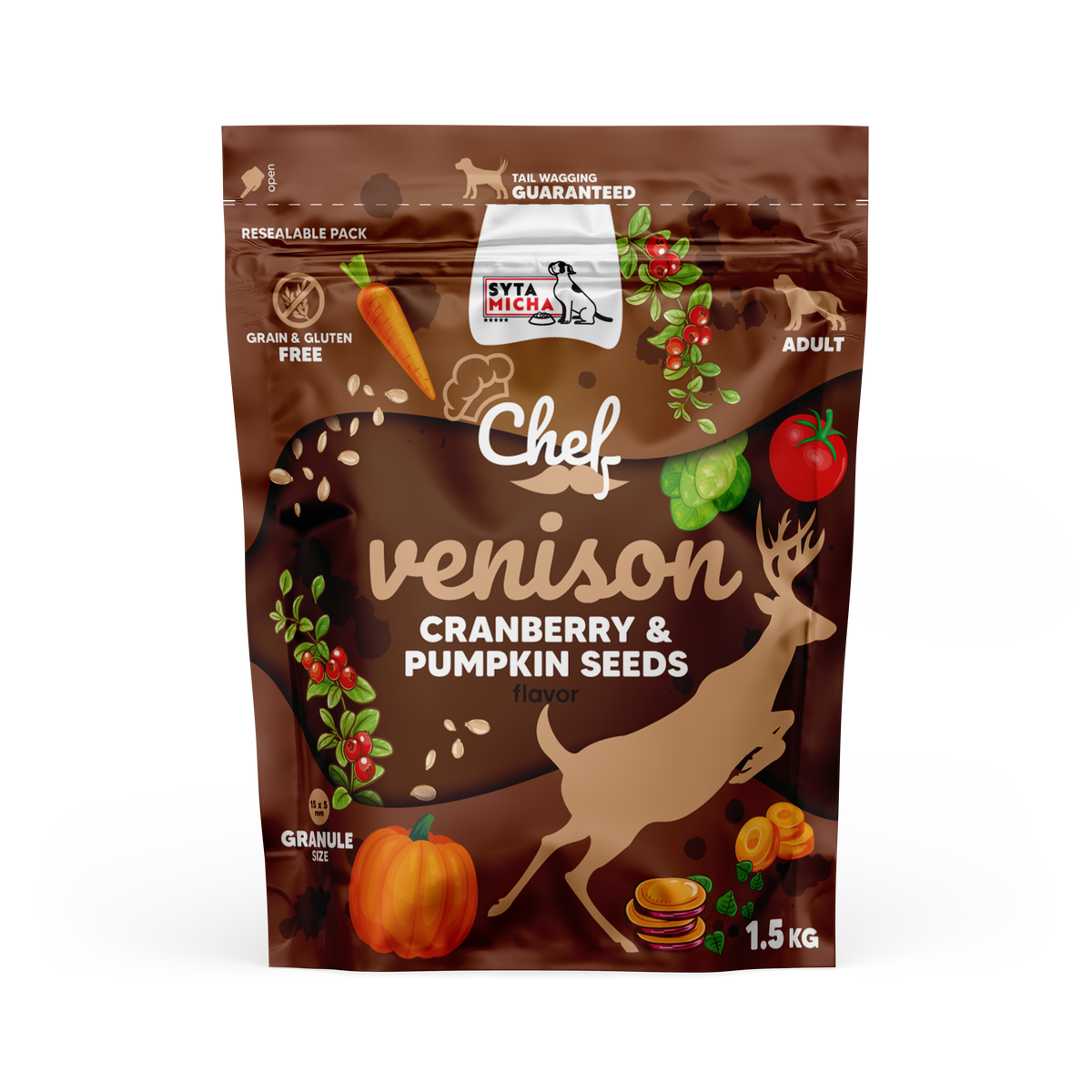 Наш сухий корм для дорослих собак Syta Micha Дичина, журавлина та гарбузове насіння — це повноцінна дієта, яка не лише задовольняє апетит улюбленця, а й насамперед піклується про його здоров’я на найвищому рівні.
