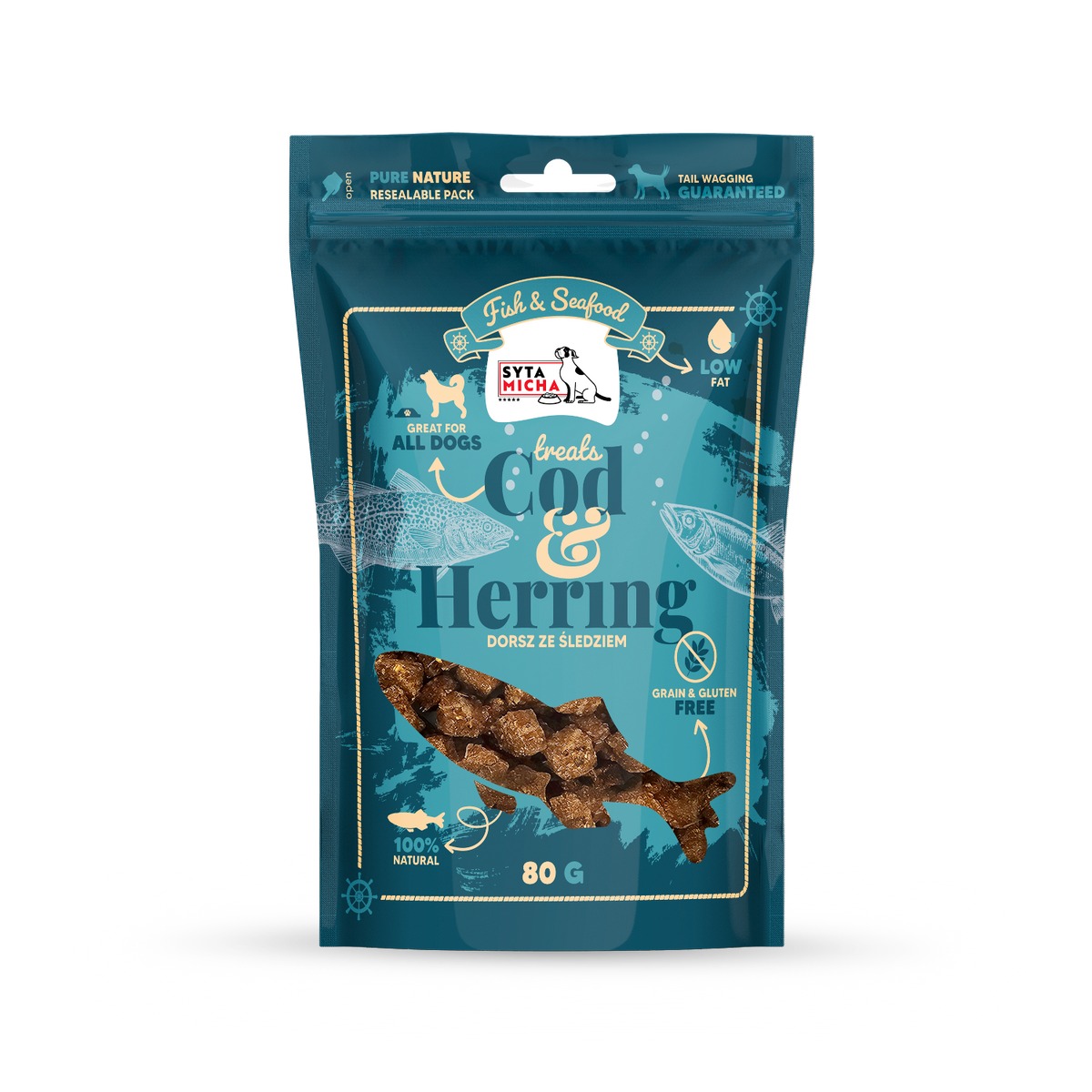 Познайомтеся з лінійкою Syta Micha Fish & Seafood – унікальні ласощі, створені для собак, які обожнюють насичені смаком рибні делікатеси. Поєднання 90% тріски та 10% оселедця – це відмінне джерело легко засвоюваного білка, цінних мінералів і корисних жирів Омега-3, які підтримують шкіру, шерсть, імунну систему та серце вашого собаки.